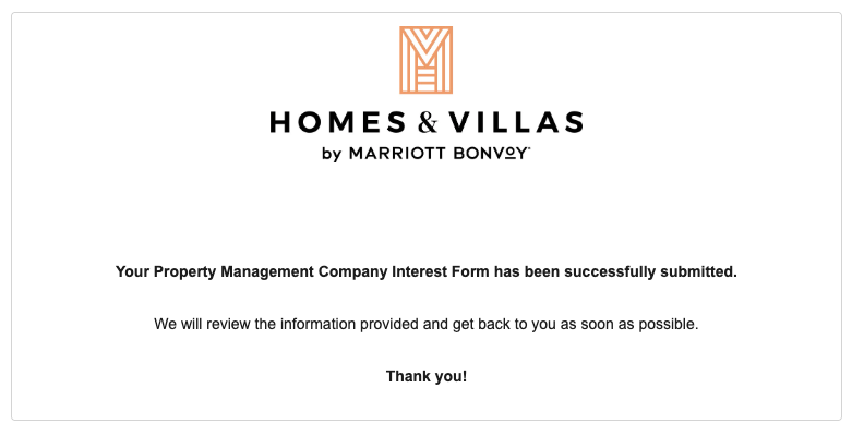 After completing the form, a representative from Homes & Villas by Marriott Bonvoy will review the information and reach out to you, via the delivered contact details.